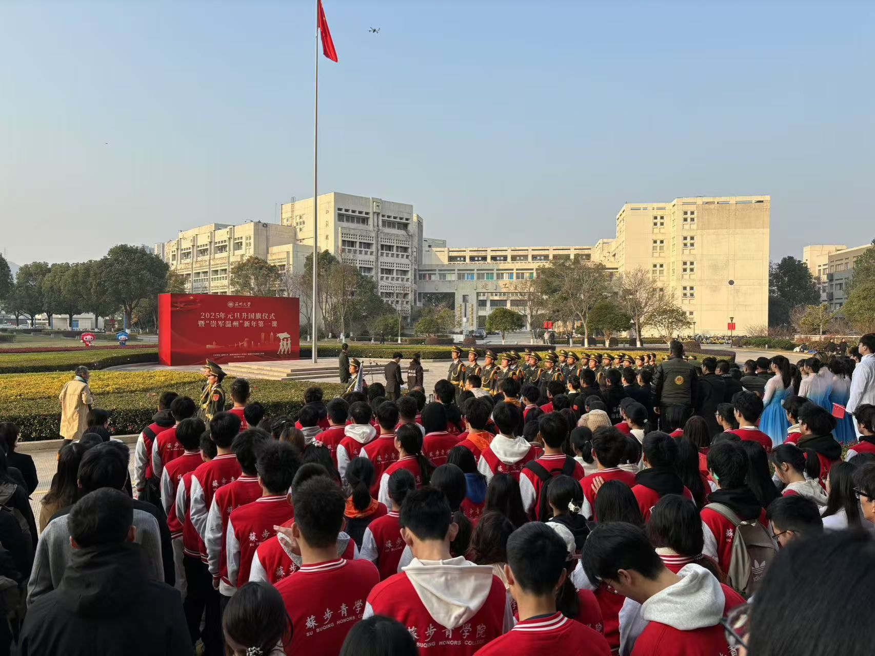 清晨8点,全院学生齐聚小鸭看看 南校区行政楼前,参加2025年新年第一课暨元旦升国旗仪式。寒冬的清晨,现场却洋溢着温暖的氛围。随着庄严的国歌声响起,五星红旗在全体师生的注目下冉冉升起。