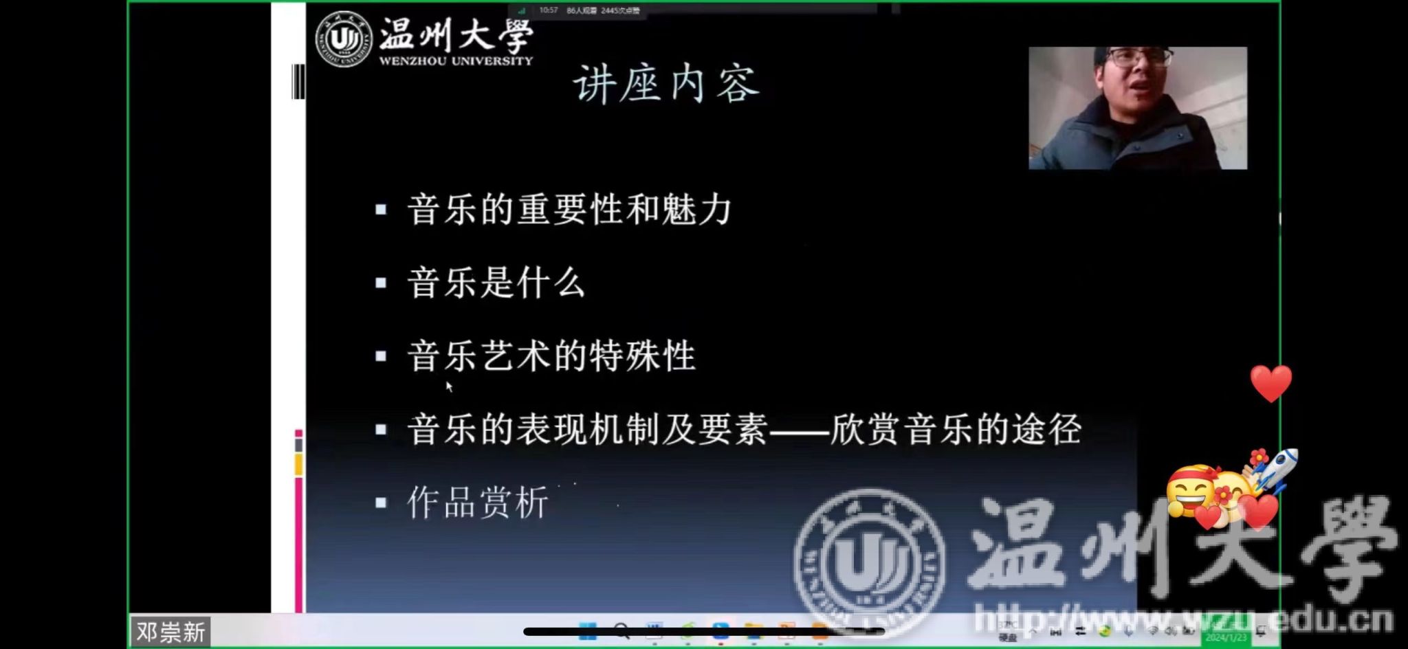 邓深海老师从音乐的重要性和魅力、音乐是什么、音乐艺术的特点、音乐的表达和结构四个维度展开讲解,并带来作品赏析。阐述了音乐是用有组织的乐普来塑造形象、反映现实生活、表达思想感情的一种艺术,普及了音乐的基本表现手段、两大部门、三度创作;讲解了音乐艺术的特殊性,告诉同学们音乐遵循作为艺术的共同原则,是反映现实世界的精神世界的产物,它和情绪相关、易感、和语气相关,是以响为材料的时间艺术,是一种普响运动过程。