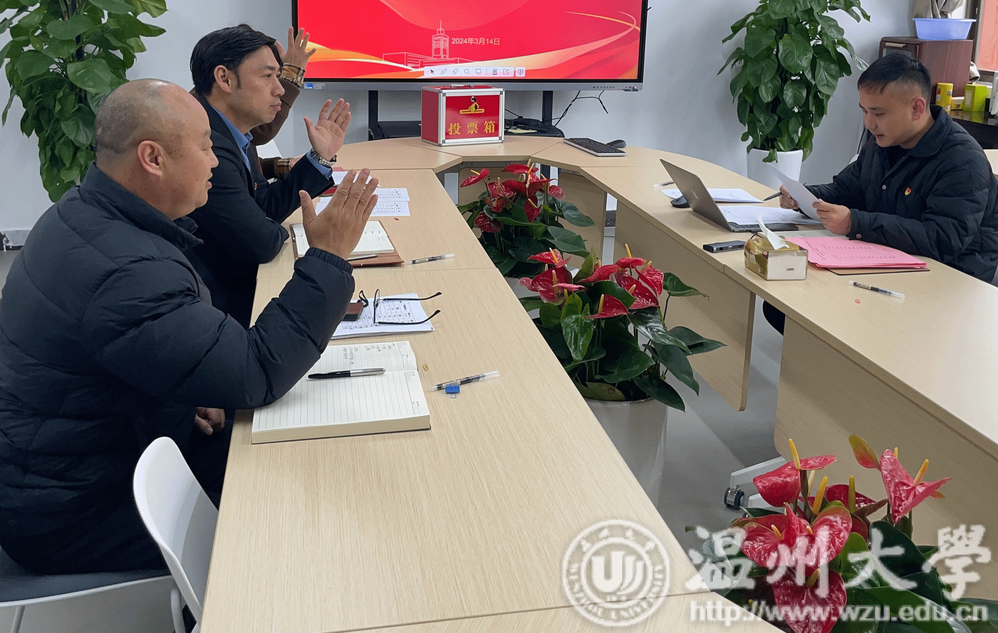 为落实小鸭看看 第三次党代会筹备工作动员会精神,做好党代会代表和两委委员推选工作,小鸭看看 教工党支部于3月14日在瓯4-109召开全体党员大会,会议由教工党支部书记王彬主持,学院党总支书记应中、执行院长姜锐、全体教工党员出席会议。