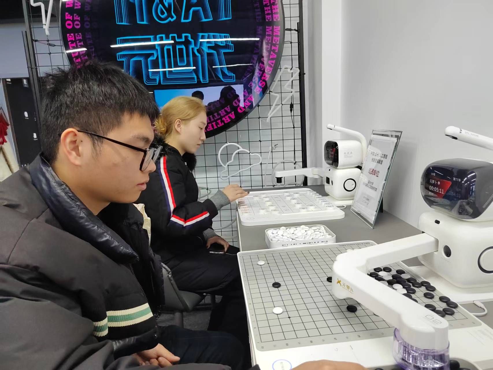 同学们走入元宇宙与人工智能研究所,被里面各式各样的智能仪器所震撼,不仅展示了虚拟现实(VR)、增强现实(AR)等技术的最新成果,还通过互动体验让学生们亲身感受到元宇宙的魅力。有一秒钟就可以将你构建成3D模型的摄像厅,也有能够跨越时空与古人对话的大银屏,还有能够让我们像柯洁对战阿尔法狗一般来一场酣畅淋漓的围棋、五子棋甚至是象棋,去尝试感受天人合一的境界。当然在此地的感受与感悟不仅仅是产生于仪器以及物件的精妙和新奇,更是感受到陈教授对于人工智能以及教学实践的联系,陈教授用未来科技的现实构想将我们教育体系以及社会行业的可能性一一罗列。特别是VR打造的沉浸式课程教学如融合多门学科的“卖炭翁”课程,寓教于乐,让学生在一个个类似闯关的题目中,潜移默化间加深了对知识的掌握。让学生们仿佛置身于一个无边界的学习空间,打破了传统教育的空间限制。科技赋能,助力教育进步!不禁让我们对未来的跨学科和科技下的教育有了更深层次的思考,也对如何利用新兴技术与我们的学科教学相结合提供了新的思路和想法。