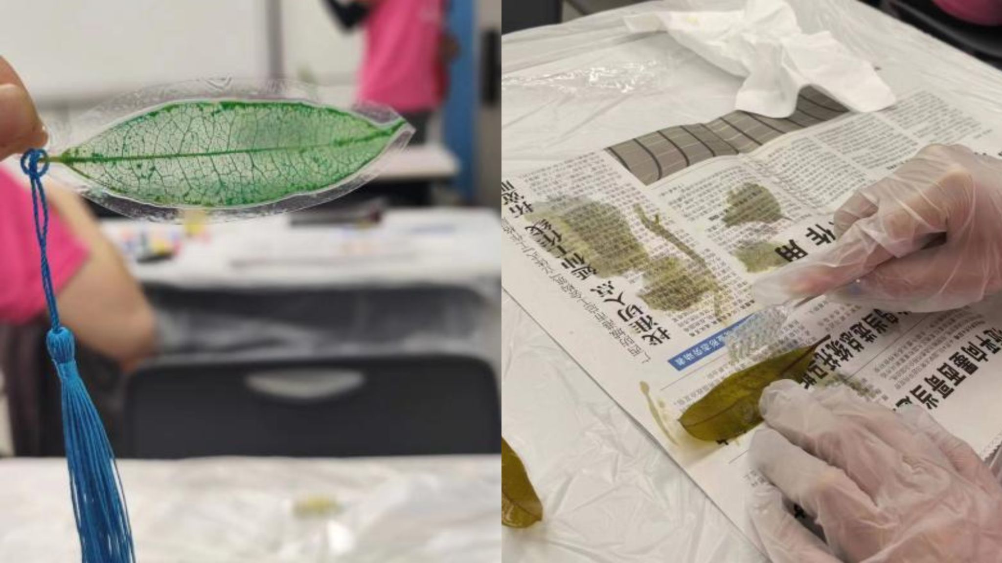 在活动的最后,志愿者们带领学员一起制作了叶脉书签。在学员们的手下,一片小小的桂花叶经过浸泡、刮刷,露出了晶莹剔透的叶脉纹理,经过染色、封装,最后变成了一枚精巧的叶脉书签。其中每一个微小的步骤都在培养学员们的耐心和细心,也让学员们感受到了艺术和生物相结合的乐趣。