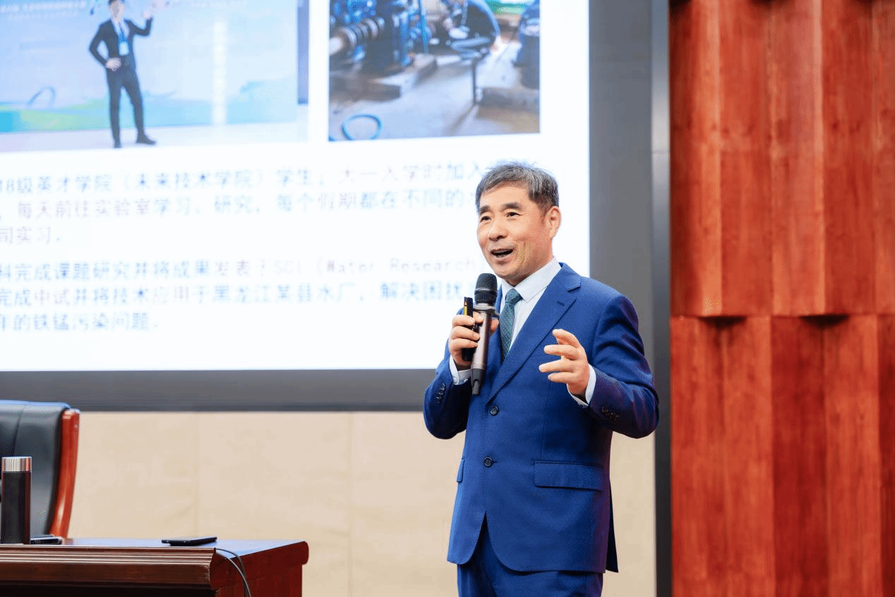讲座最后,马军院士分享了学生培养过程的案例,并提出,大学阶段是培养自身素质、综合能力、特色方向和积蓄潜力的黄金时期。作为步青科学实验班的学子,要积极发挥自身主观能动性,逐渐形成系统的知识结构,形成自身特色。同时,要注重学科交叉,了解前沿科学动态,为未来的学术科研打下基础。他鼓励同学们,要有信心、有决心、有毅力、有勇气,他希望同学们能够脱颖而出,成为拔尖创新人才。