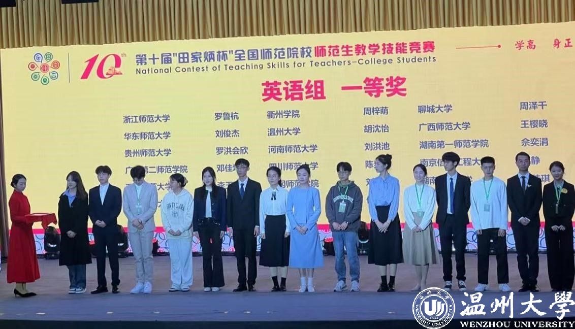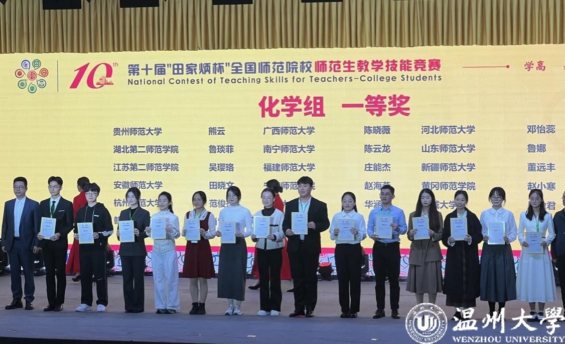 2024年11月30日至12月1日,第十届“田家炳杯”全国师范院校师范生教学技能竞赛决赛在浙江师范大学举行。本次竞赛吸引了来自全国250所院校的1831名选手参加,参赛院校数与选手数均创历史之最,决赛最终角逐产生一等奖176 名,二等奖 333 名。温大参赛选手斩获2个一等奖、3个二等奖,4个三等奖,1个优胜奖,获奖率100%,获一等奖数量和获奖总数排名均列全国第20位。