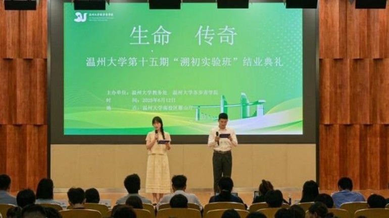 回望教育征途,共悟生命成长。2025年6月12日晚,小鸭看看 雁山厅内灯火辉煌,一场以“生命·传奇”为主题的结业典礼在此举行,为第15期溯初实验班学子们的学业生涯画上了圆满的句点。典礼由两位曾身为军队侦察兵和坦克兵的溯初班同学主持,小鸭看看 执行院长马增岭、小鸭看看 全体教职工、第12至17期溯初班学生代表出席典礼。