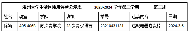 本学期以来,学校开展“安•净”专项行动,对宿舍区域进行安全大检查。根据学校第二周寝室检查结果,排查到徐颖同学违规使用电器,现给予院级通报批评,具体情况如下:
