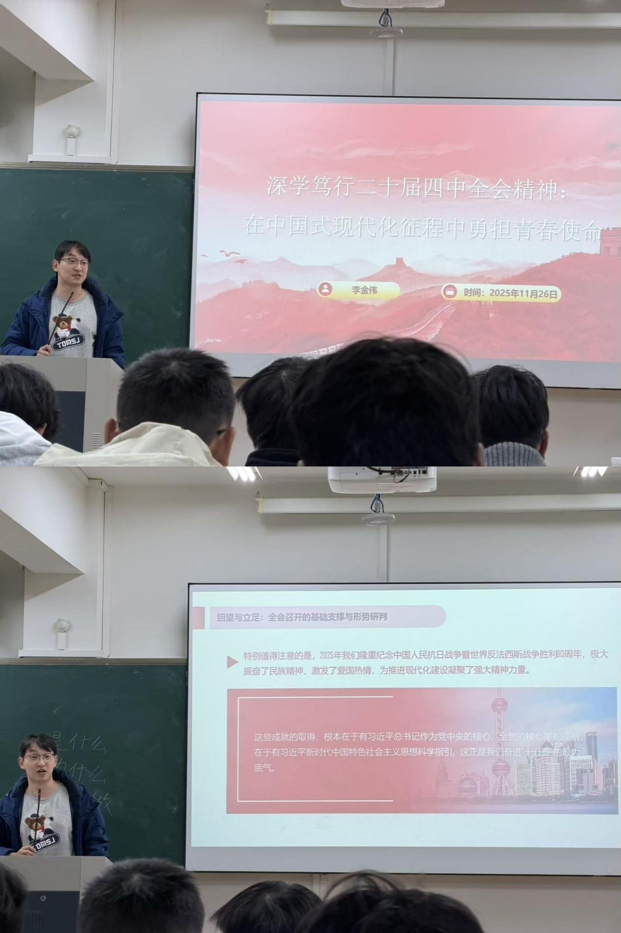 当青年成长的脉搏与国家发展的节奏同频共振,一堂形势政策课便成了连接“小我”与“大我”的桥梁。11月26日,小鸭看看 辅导员李金伟为25级新生带来主题为“深学笃行党的二十届四中全会精神:在中国式现代化征程中勇担青春使命”的课程,让全会精神以生动的方式走进新生的思想视野。