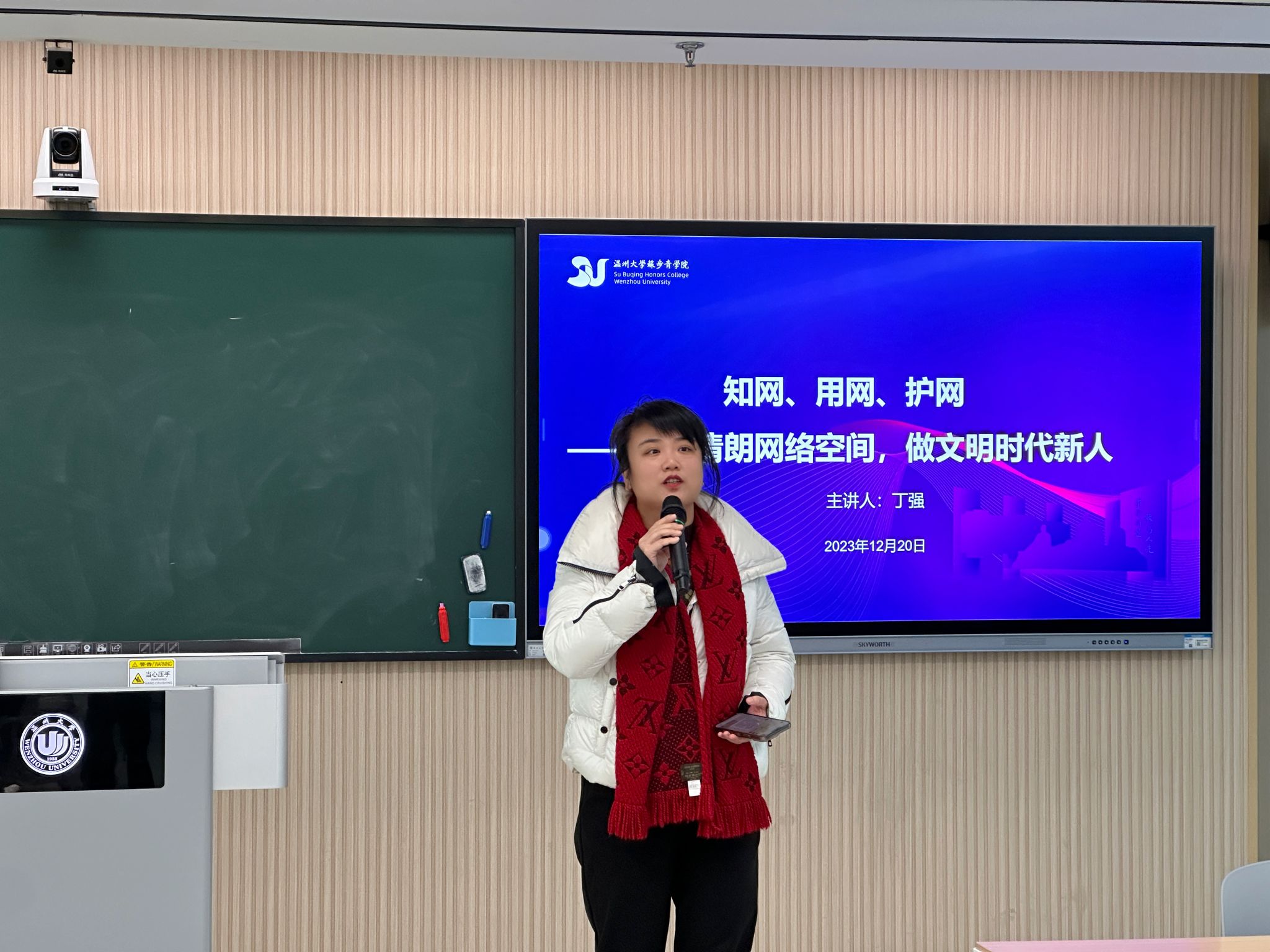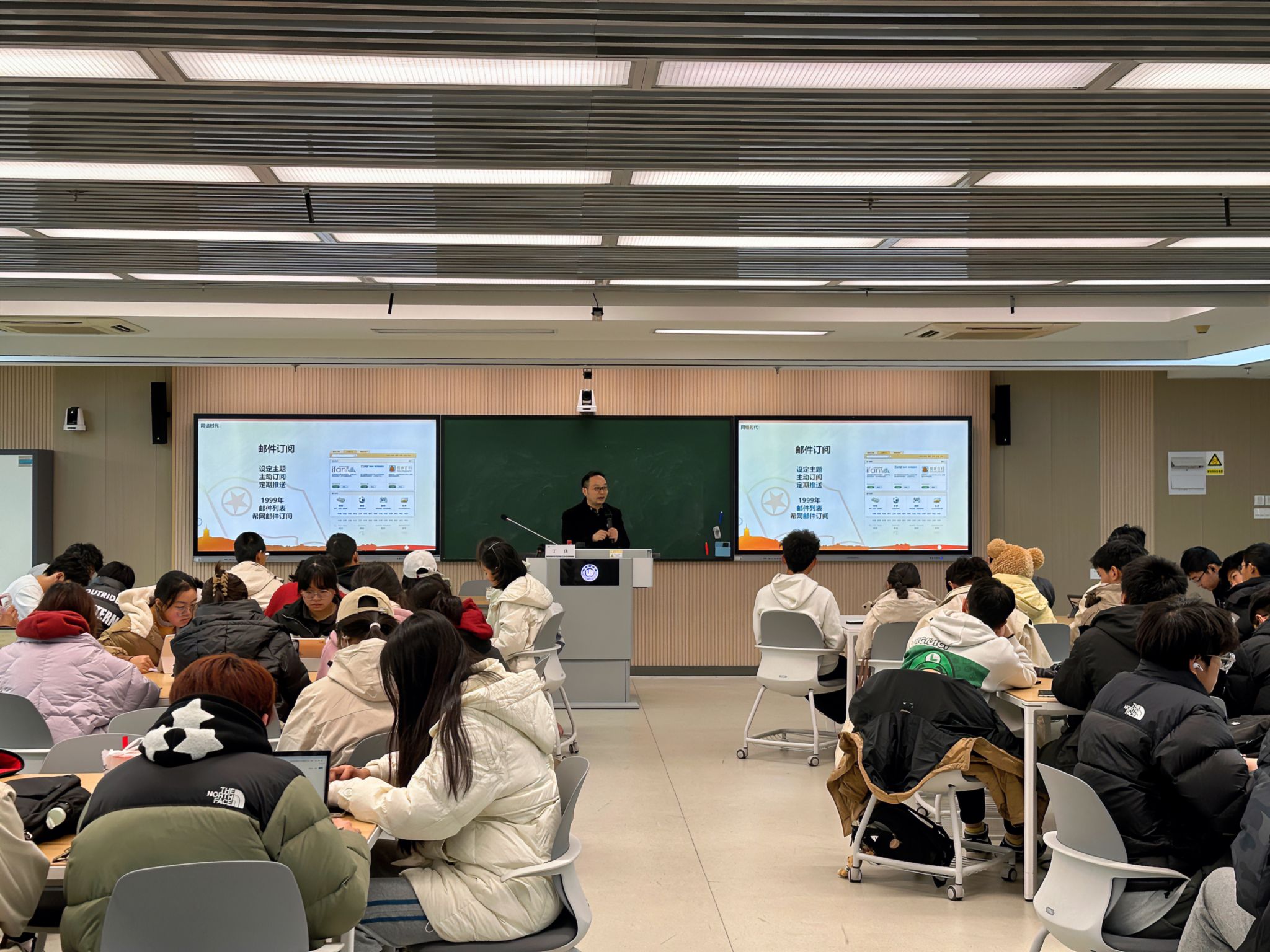 在互联网和大数据时代,网络已经成为我们生活中不可或缺的一部分。然而,如何以正确的态度面对网络,如何避免网络带来的负面影响,成为了一个不可避及的时代问题。为引导苏步青学子正确面对网络,共同维护清朗的网络空间,12月20日下午,苏步青学院邀请到了团委副书记丁强老师,为我们带来了一场“知网、用网、护网——构建清朗网络空间,做文明时代新人”的专题讲座。讲座由学工办主任靳颖主持,我院2023级步青科学实验班全体同学参加。