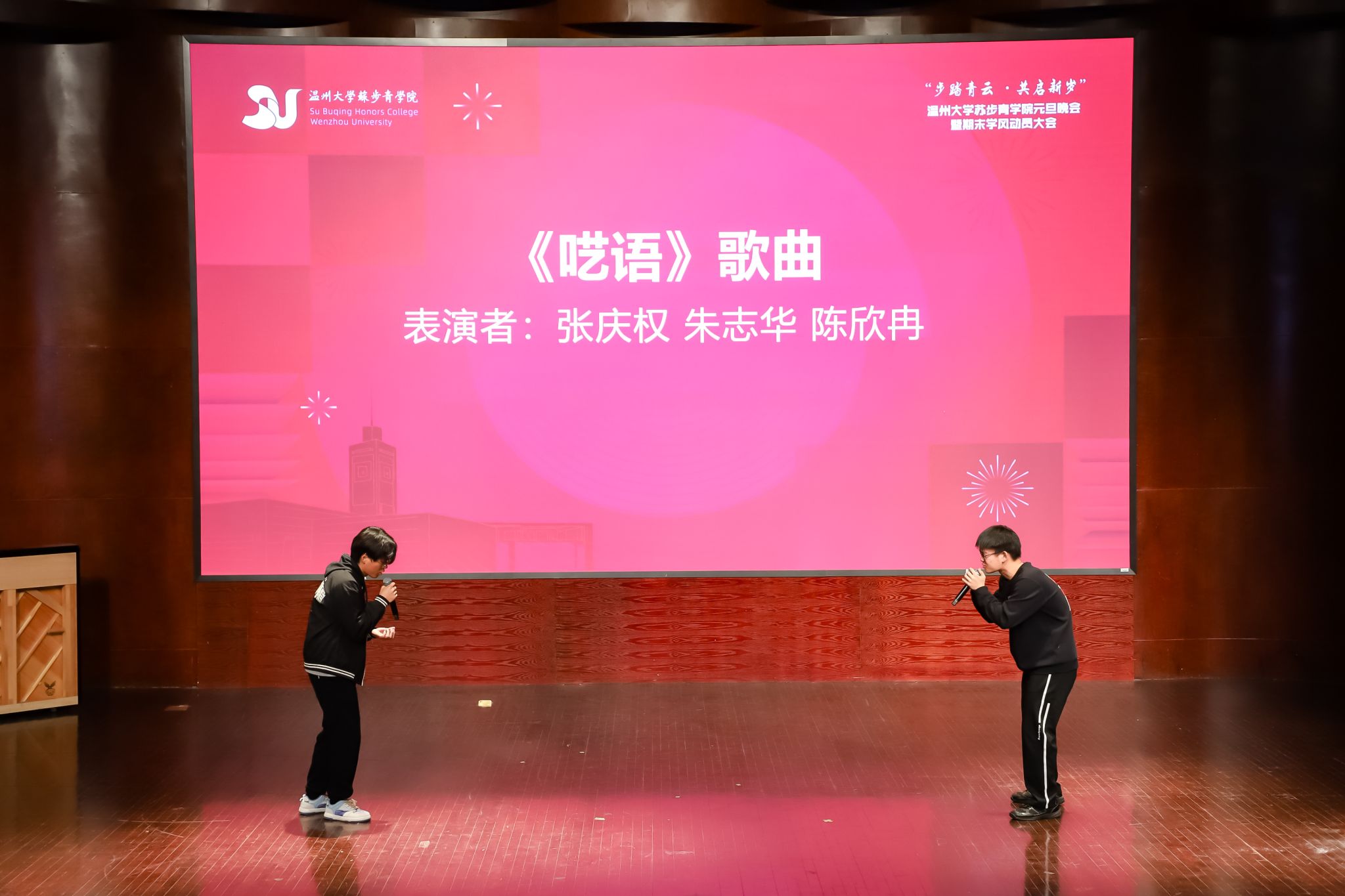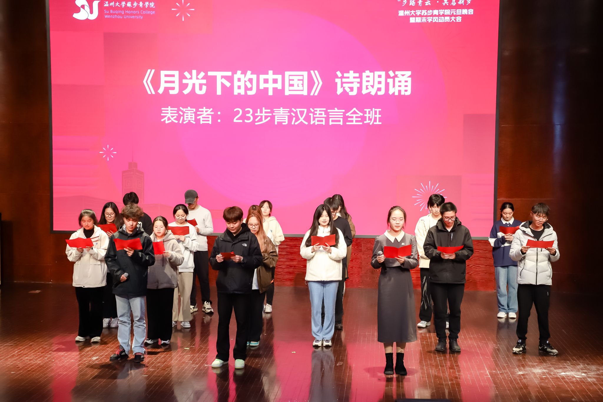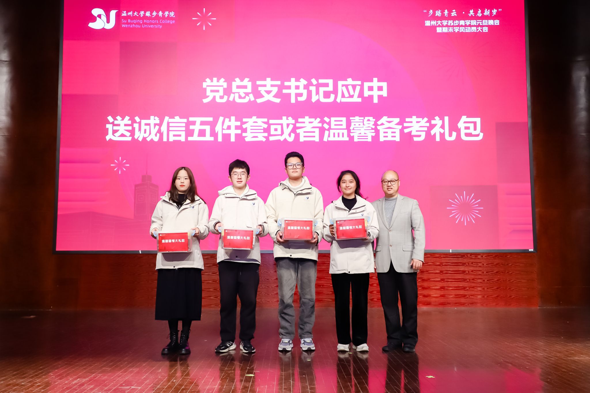 岁月不居,时节如流。转眼间,2023年已近尾声,全新的2024年正向我们走来。为了深入推进苏步青学院的学风建设,传承和弘扬苏步青先生的精神,12月28日晚18点30分,苏步青学院在温州大学南校音乐厅隆重举办了“步踏青云,共启新发”元旦晚会暨期末学风动员大会。