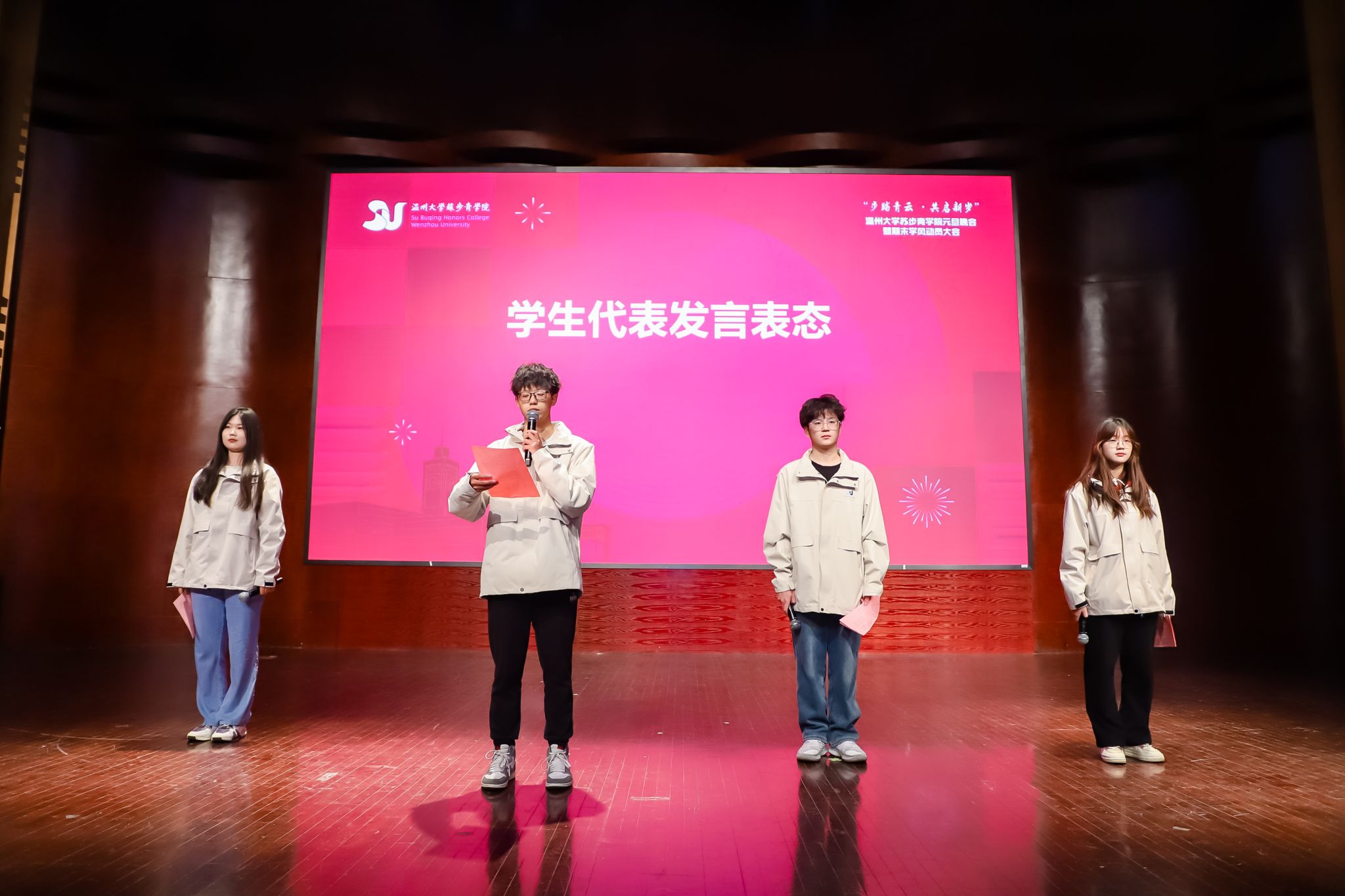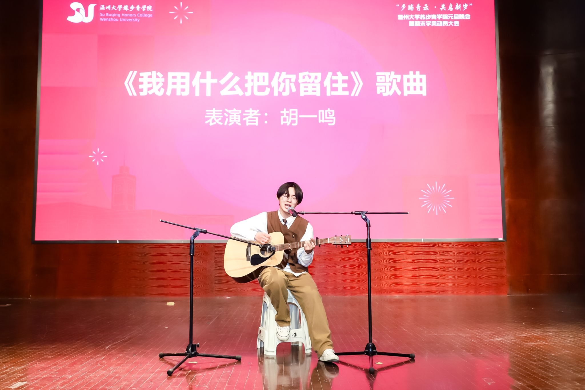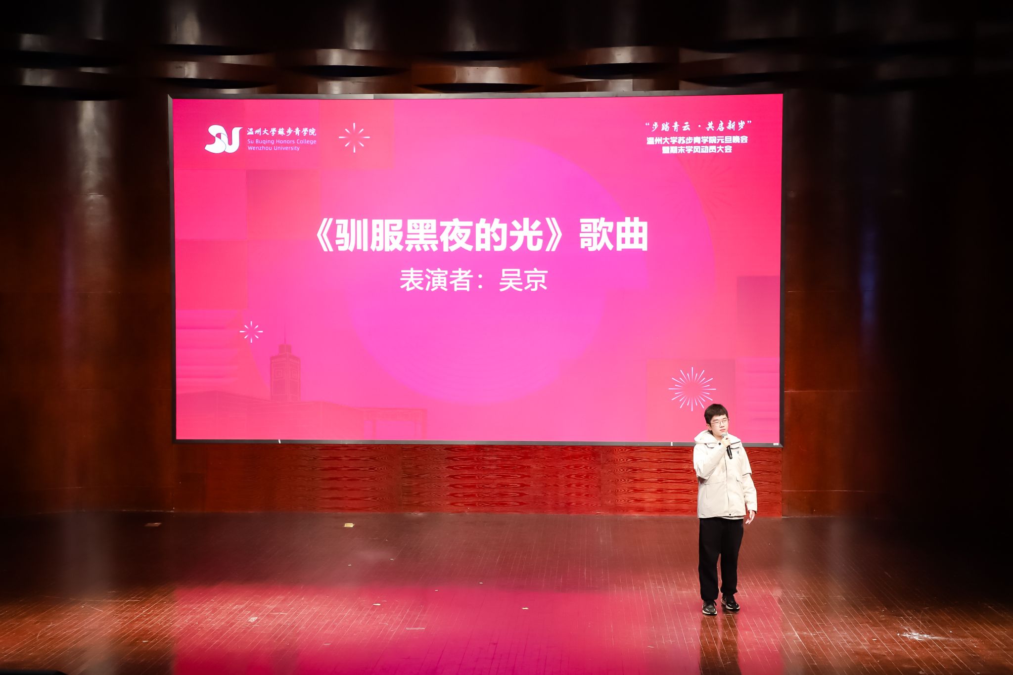 岁月不居,时节如流。转眼间,2023年已近尾声,全新的2024年正向我们走来。为了深入推进苏步青学院的学风建设,传承和弘扬苏步青先生的精神,12月28日晚18点30分,苏步青学院在温州大学南校音乐厅隆重举办了“步踏青云,共启新发”元旦晚会暨期末学风动员大会。