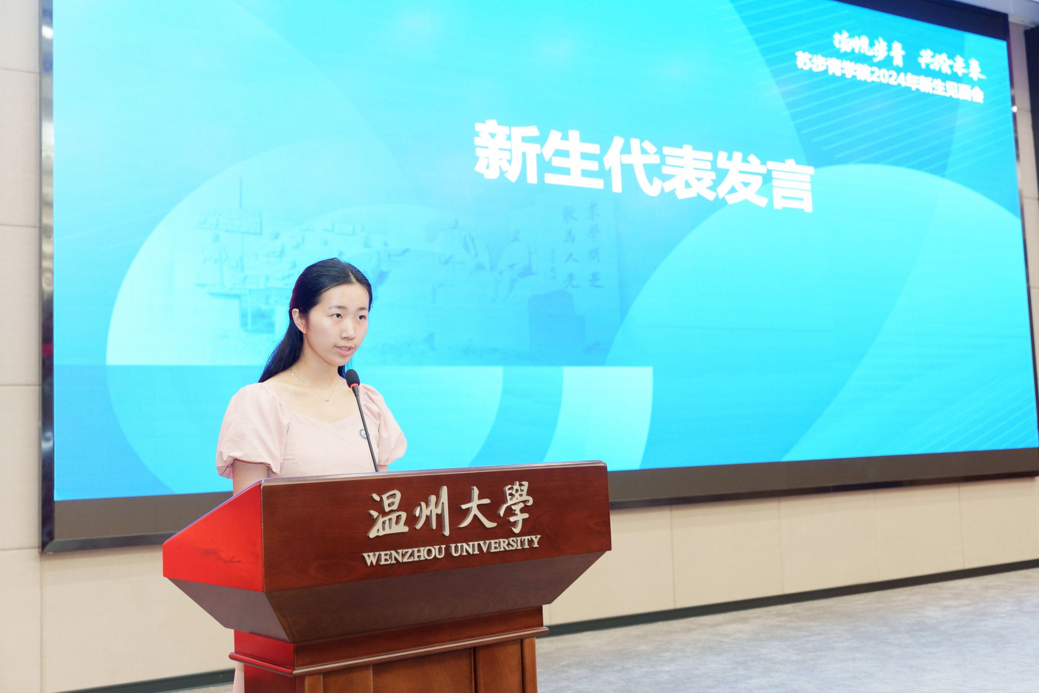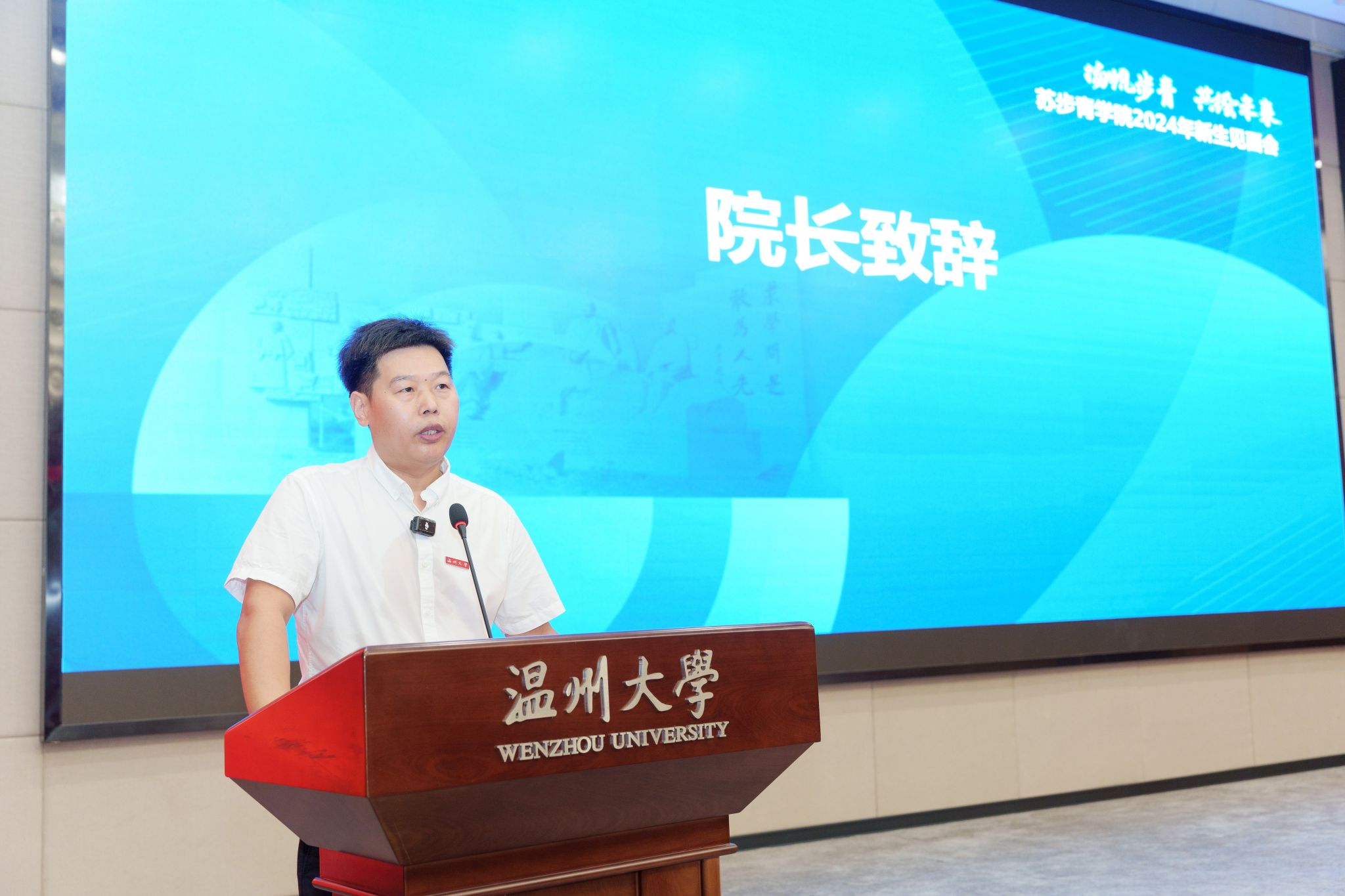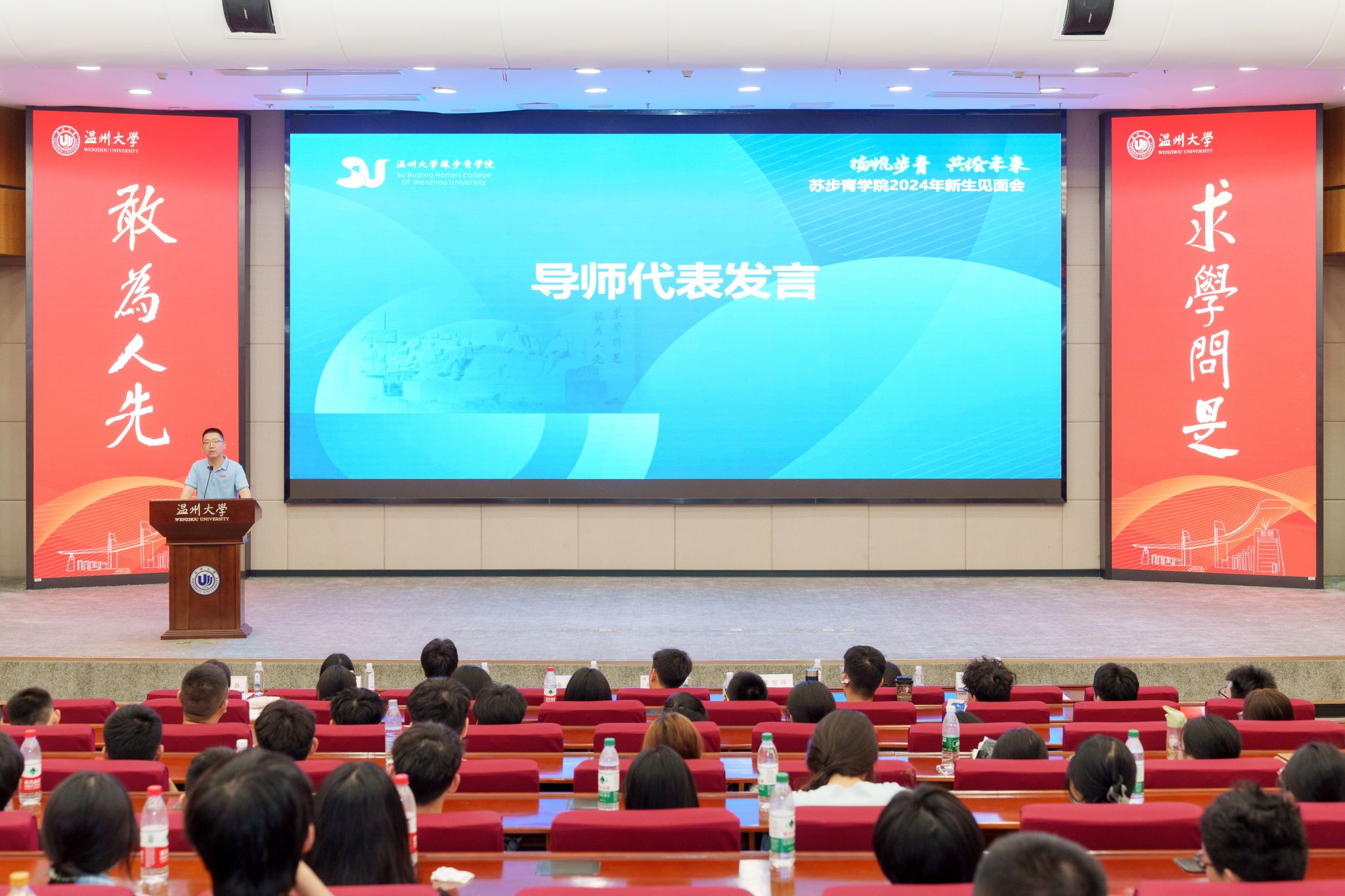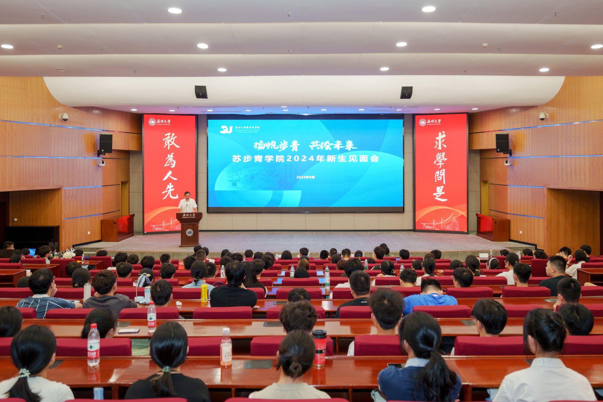 金秋送爽、硕果飘香,9月5日上午,温州大学苏步青学院于育英图书馆二楼大礼堂举行2024级新生见面会。苏步青学院执行院长马增岭、党总支书记潘从义,24步青数学、化学、生物、汉语言学业导师黄琼伟、吕宁宁、左俊、程安霞,学院办公室、教学科、学工办教师出席,见面会由潘从义主持。