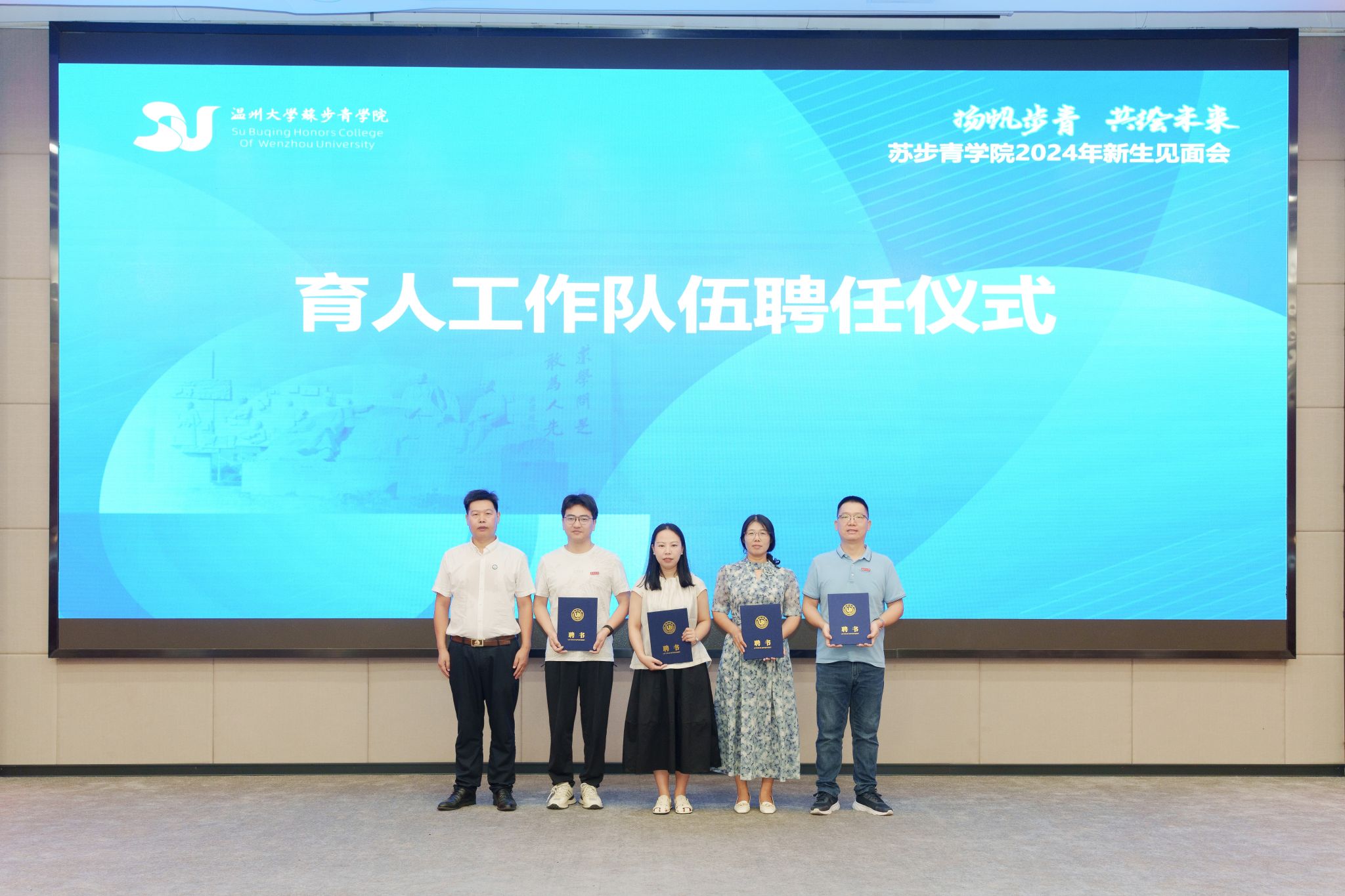 随后,见面会举行育人工作队伍聘用仪式,马增岭为步青实验班四位学业导师,潘从义书记为四位班助分别颁发聘书,体现学院对人才培养的高度重视,也让新生们感受到了来自学院和老师的深切关怀与殷切期望。
