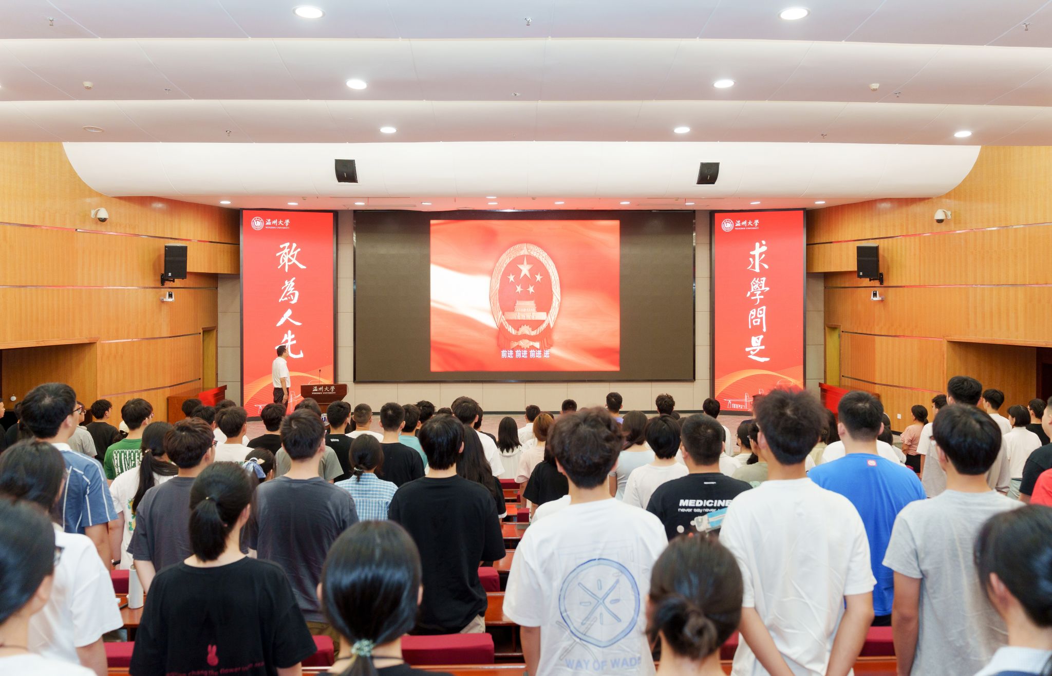 见面会在雄壮的国歌声中拉开序幕,全体师生起立,奏唱《义勇军进行曲》。铿锵激昂的国歌旋律中,24级步青学子们以坚毅自信的面容,展现出他们立志奋斗、科研报国的决心。这一刻,梦想在礼堂上空翱翔,青春的华章正式奏响。