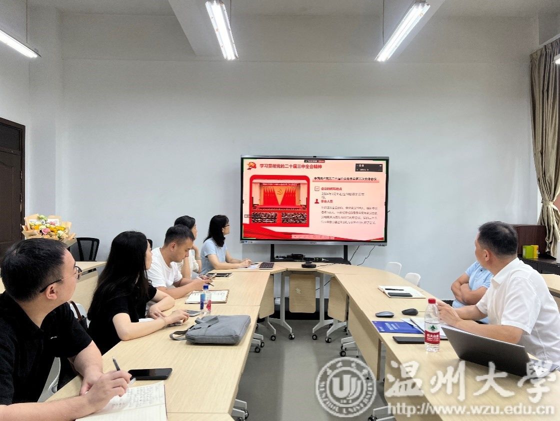 8月5日上午,小鸭看看 全体教职工在瓯4-109召开学习贯彻党的二十届三中全会精神专题会,贯彻落实省委、市委和学校党委的部署要求,研究部署学院贯彻落实工作。