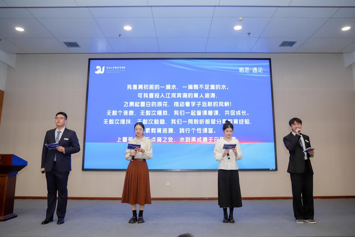 典礼第一篇章为师范生教学技能竞赛表彰。首先由王舜副校长致辞。王舜指出,今年是全面贯彻落实党的二十大精神和推进中国式现代化建设的开局之年,也是温州大学办学90周年、溯初实验班创设15周年的关键节点。溯初实验班作为温州大学师范卓越人才培养改革试点班,自成立以来获得社会各界高度认可。在浙江省高等学校第十六届师范生教学技能竞赛上,溯初实验班学员发挥主力作用,成绩斐然。就溯初实验班工作,王舜提出“深化协作,打造品牌旗帜”“优化课程,达成办学实效”“强化担当,提高专业素养”三点要求,着力推动溯初实验班发展。