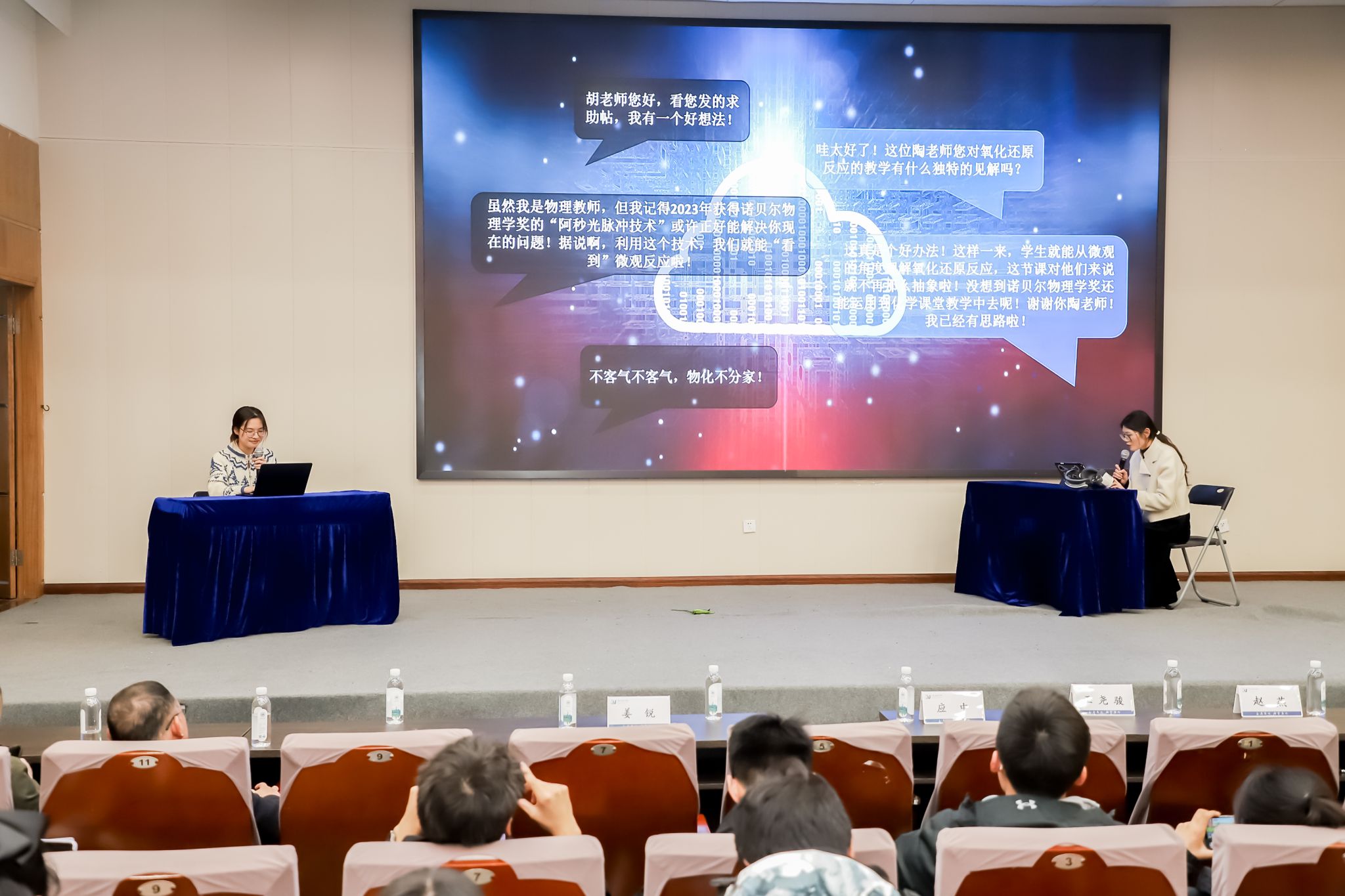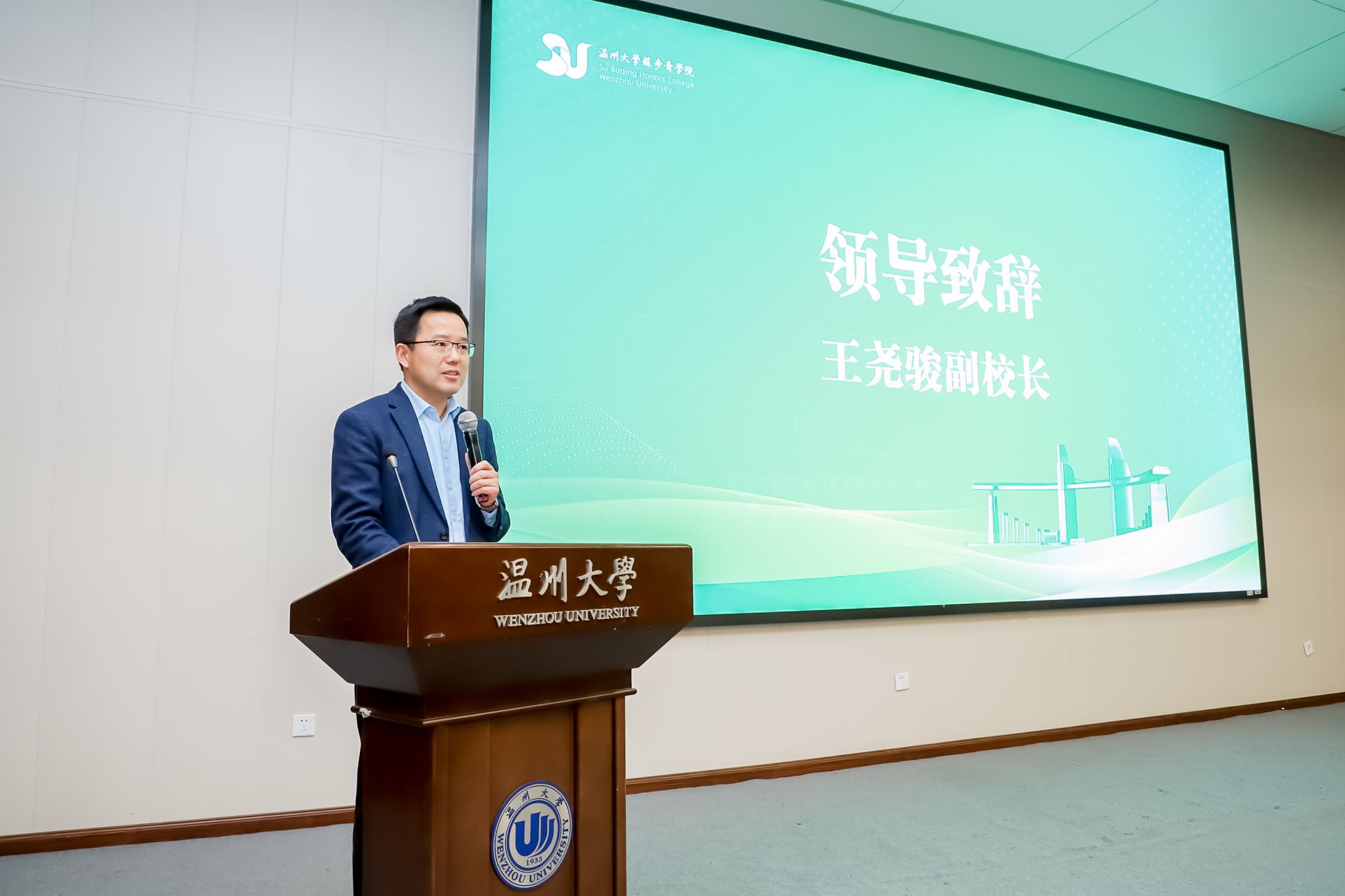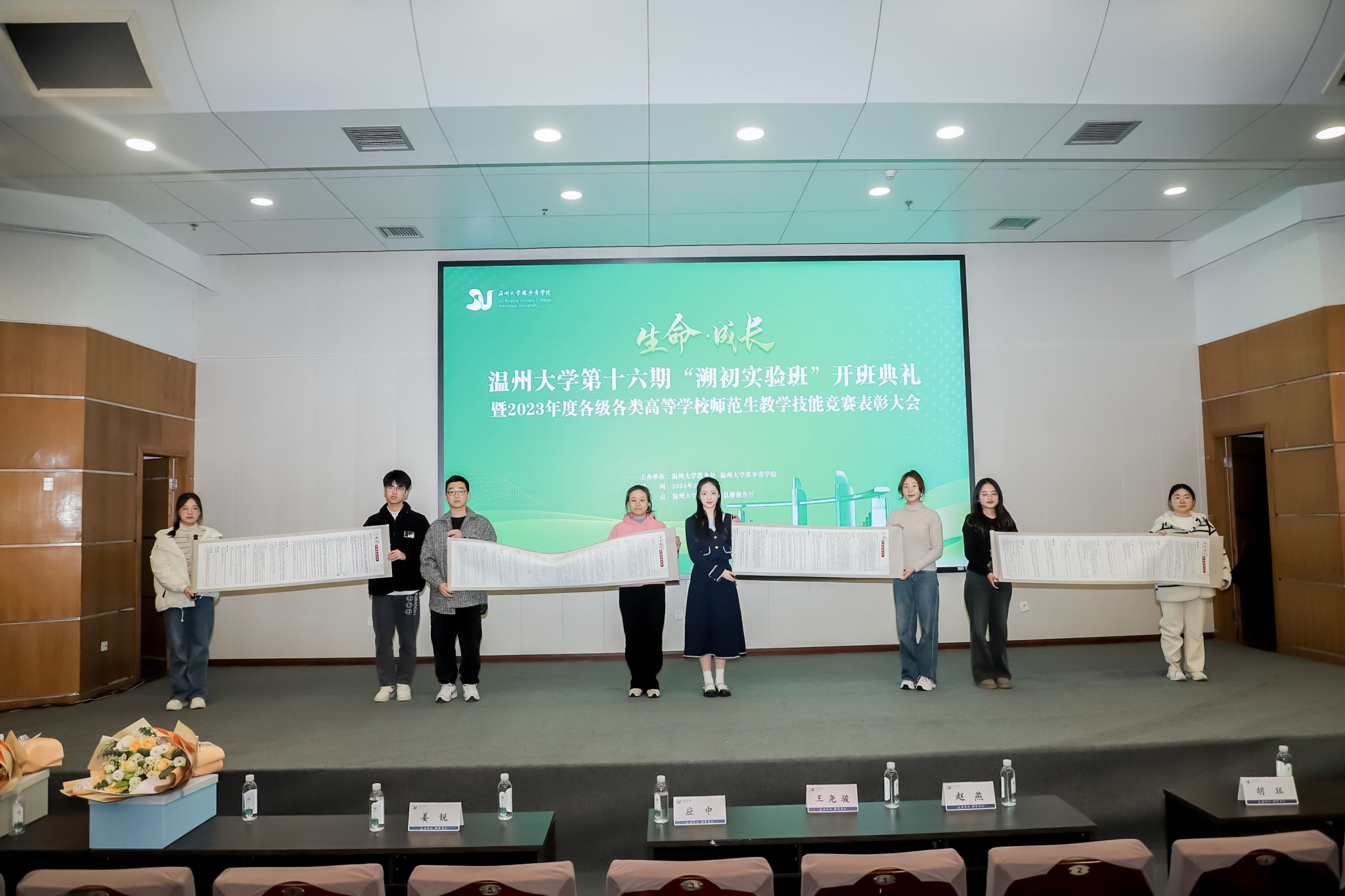 3月13日中午,温州大学第十六期“溯初实验班”开班典礼暨2023年度高等学校师范生教学技能竞赛表彰大会在北校区信息楼报告厅隆重举行。温州大学副校长王尧骏、苏步青学院党总支书记应中、教务处副处长赵燕、苏步青学院执行院长姜锐,师范生教学技能竞赛指导师团队等出席,师范生技能竞赛参赛选手参加。典礼由第十四期溯初实验班学员主持,他们以双语形式流畅切换,展现了温州大学溯初实验班学员扎实的语言功底和自信风采。此次典礼汇聚了第十四、十五期溯初实验班的参赛选手与第十六期的新鲜血液,共同见证了这一庄重而盛大的时刻,彰显了温州大学在师范生培养方面的卓越成果与无限活力。