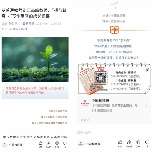 苏步青学院陈智峰教授的《“捅马蜂窝式”写作带来的成长惊喜》一文于6月12日在教育部主管、国家主流教育媒体《中国教师报》“名师”版发表后,《中国教师报》公众号当天予以推送,目前阅读人数已达10万+,并引发了热议。