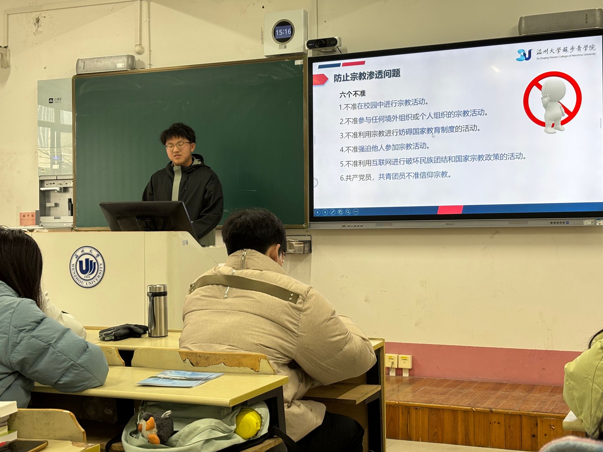 随后,各班学业导师开展马克思主义宗教观教育。最后,各班学业导师针对学生寒假结束后的作息紊乱与情绪焦虑等常见心理不适症状给出相应心理调适方法,帮助学生们尽快适应新学期学习生活。同时学业导师们还提醒学生们注意春季常见传染病,并给出相应预防措施。