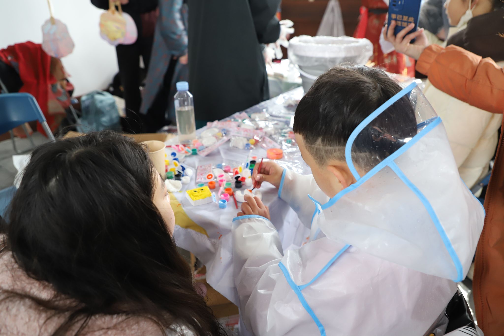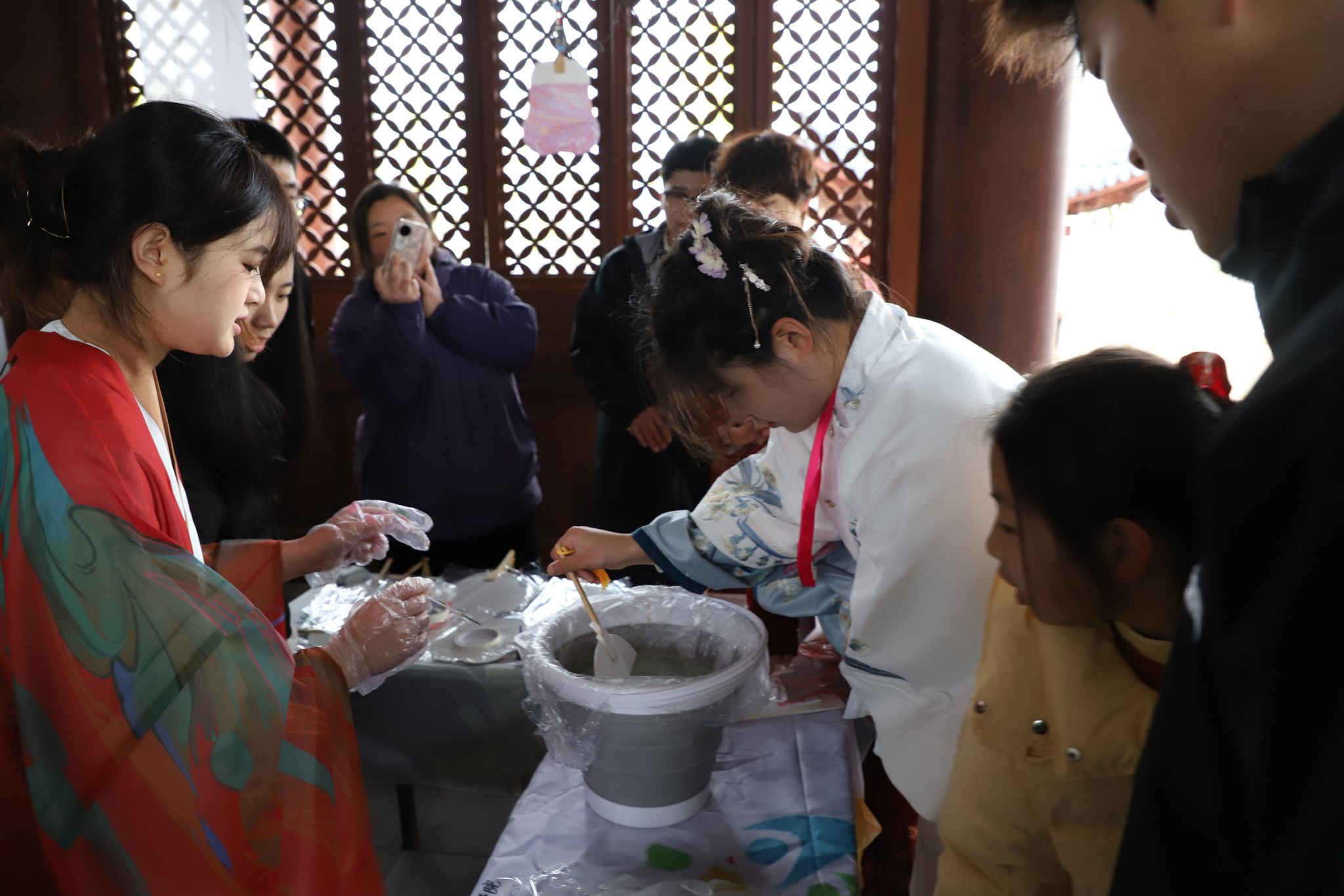 清晨,志愿者们乘船渡江抵达江心屿,细雨蒙蒙,在古韵悠长的岛屿上支起公益摊位。学生们身着汉服,飘逸的衣袂与温婉的举止瞬间吸引了孩子们的目光。在“星孩”家长们的鼓励下,许多孩子主动走近摊位,用好奇的目光探索着石膏娃娃涂鸦与漆扇活动。志愿者们以轻柔的语调引导孩子挑选颜色、尝试亲手创作,汉服的古典韵味与孩子们的纯真笑脸相映成趣,营造出跨越时空的温情画面。